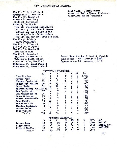 Image # 1407 - 1934 New Ulm American Legion Baseball Season Summary and Individual Statistics 1934 Season Summary and Individual Batting Statistics for the New Ulm American Legion Baseball Team. |
