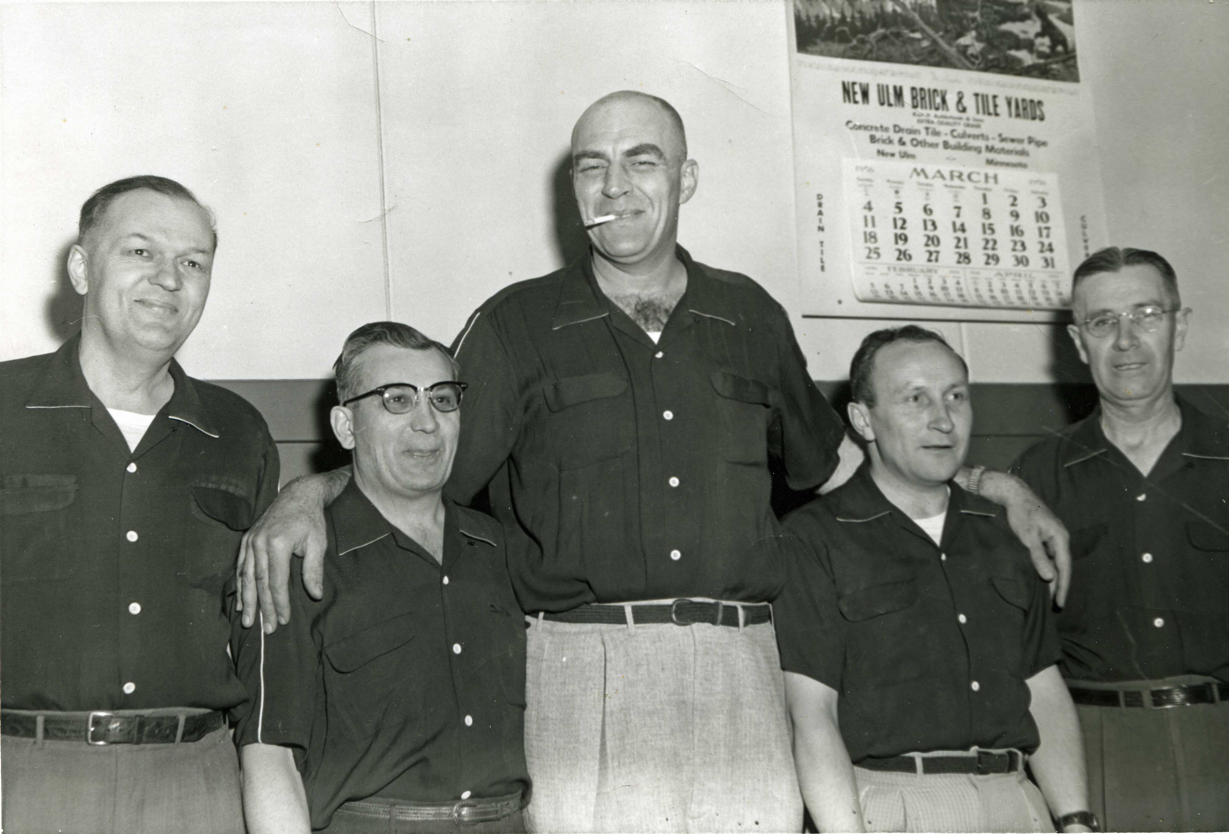 Image # 2381 - 1956 Marti's Bar City League bowling team Marti's Bar team which finished in sixth place in City League at Concordia Lanes in 1956 bowling. Individual pictures were made from the team photographs taken that year to compile the bowling annal. L-R: Lee Gaut, Harold Forster, Dr. Joe Burnett, captain Leon Reinhart and George Schlieman. This 5x7 print was pu... (Click on the image for a full description) |