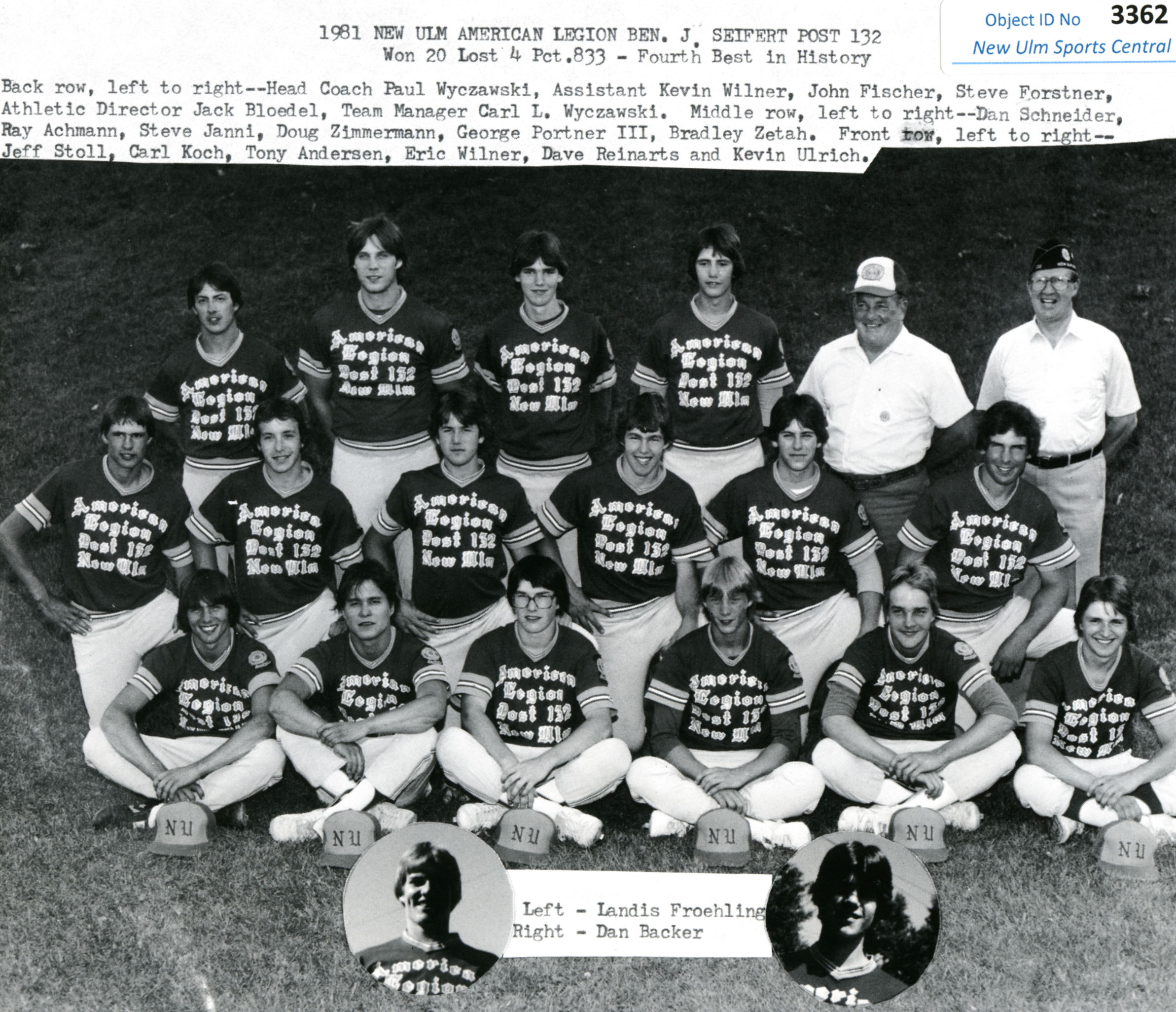 Image # 3362 - 1973 New Ulm American Legion Baseball Team Positive screen print of squad picture of legion team for year. Print produced by Master Graphics from offset negatives of original photographs from Carl Wyczawski collection. Team was 12-5 but lost out in the first game of the District tournament. L-R, front: bat boy Dave Tauer, Greg Schmitz,George Weier, John ... (Click on the image for a full description) |
