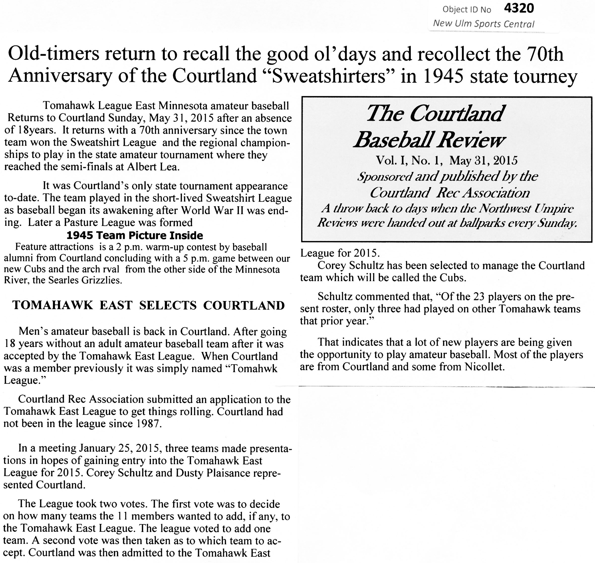 Image # 4320 - 2015 Coutland marks return to Tomahawk baseball with special day. Object used in preparation of Courtland Baseball Review history flyer of 2015 gathered and produced by Myron Fluegge for Courtland Rec Association with graphics and editing assistance by Herb Schaper of New Ulm Sports Central to usher Courtland into the website history project. Lead article in Courtland Review pub... (Click on the image for a full description) |