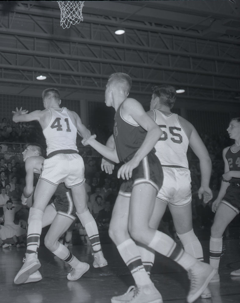 Image # 4215 - Springfield vs Sleepy Eye Holiday Tournament 1956 Holiday Tournament action shots Springfield vs Sleepy Eye 2 negatives available |