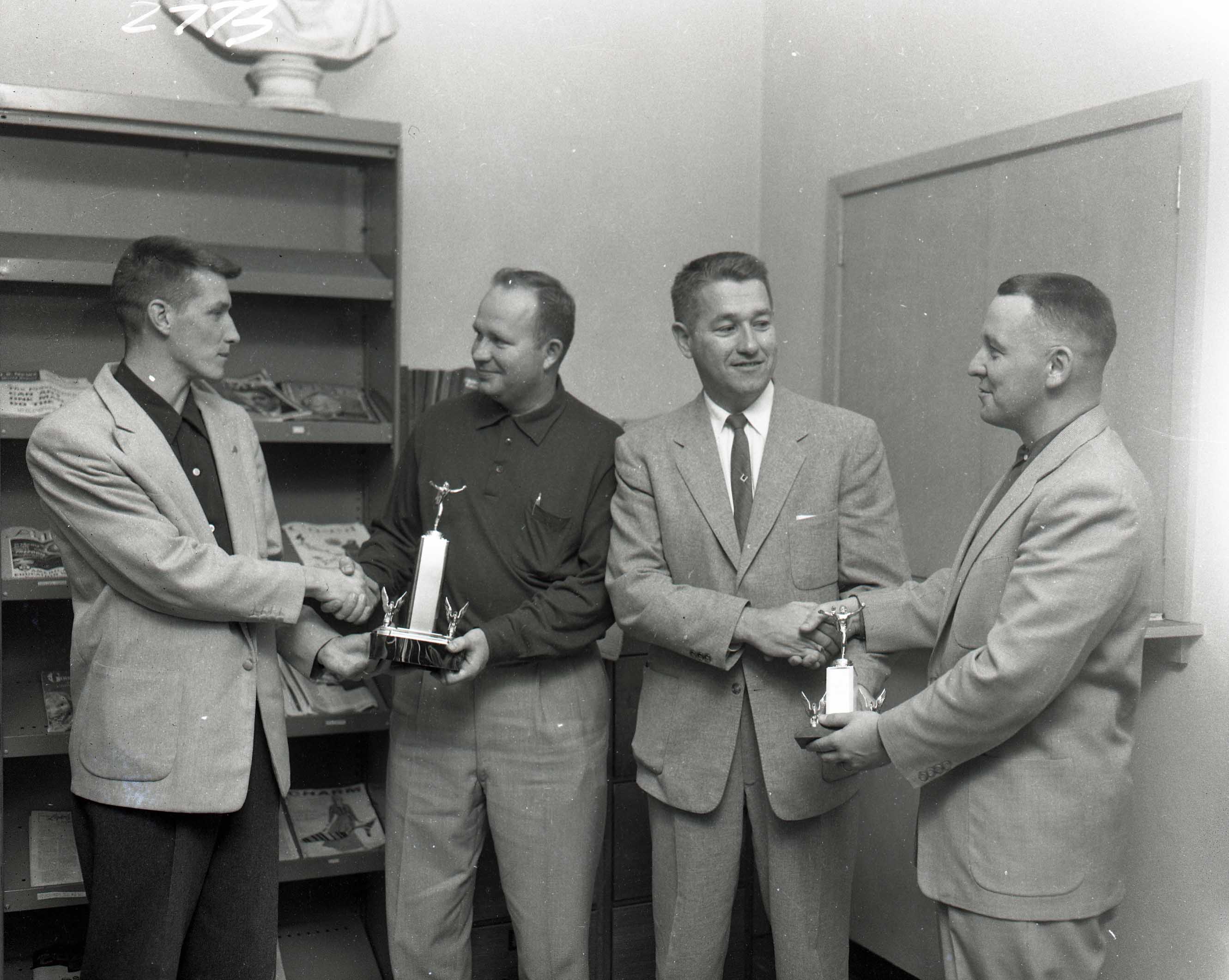 Image # 2273 - 1957 212 Conference football champions awarded coaches Two 4x5 negatives from 212 Conference meeting of football coaches during which trophies were awarded. Identified were Don Hill, Sacred Heart; Bob Hage, Hector; Ken Gulbrandson, Stewart and Don Bjelland, Brownton. |